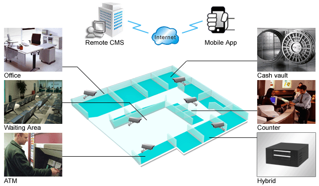 | Central monitoring software is available for multi-regional businesses, such as stores, restaurants or banks. |